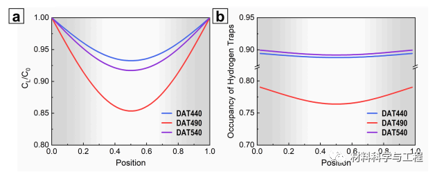 图 11. 充电 24 小时的平板试样中的模拟氢分布:(a)晶格间隙中的归一化氢含量,以及(b)陷阱占用率。