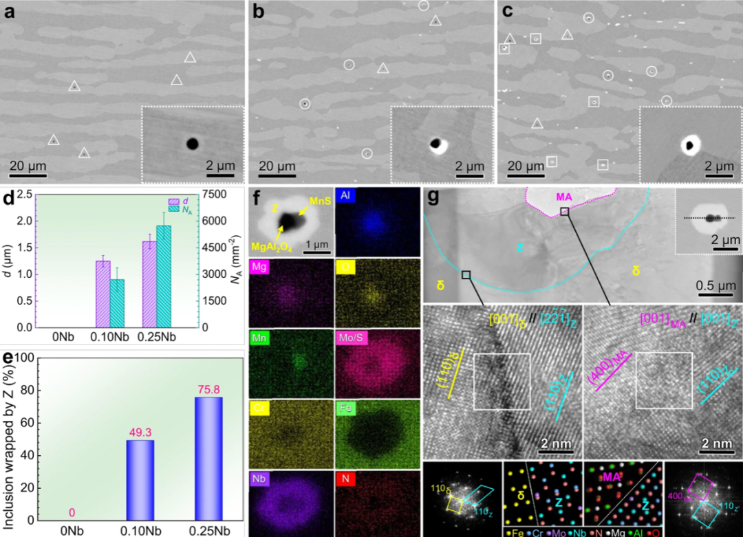 图2为包合物@ Z核壳结构的表征。固溶态S32205双相不锈钢中夹杂物和Z相的存在状态:a 0 Nb,b 0.10 Nb和c 0.25 Nb。三角形、圆形和方形分别表示单个夹杂物、夹杂物被Z相部分包裹和完全包裹。插入物呈现单包合物和包合物@ Z核壳结构的形貌。d Z相的平均等效直径( d )和数密度( NA )。( d )中的所有误差条表示标准差( n = 30次独立实验) . e Z相包裹的夹杂物比例. f EDS元素面扫描0.25 Nb钢中夹杂物@ Z核壳结构. g TEM,HRTEM图像和0.25 Nb钢中夹杂物@ Z核壳结构的相关衍射花样. ( g )中MA为铝酸镁夹杂物的简称,( g )中δ为铁素体相。源数据以源数据文件的形式提供。