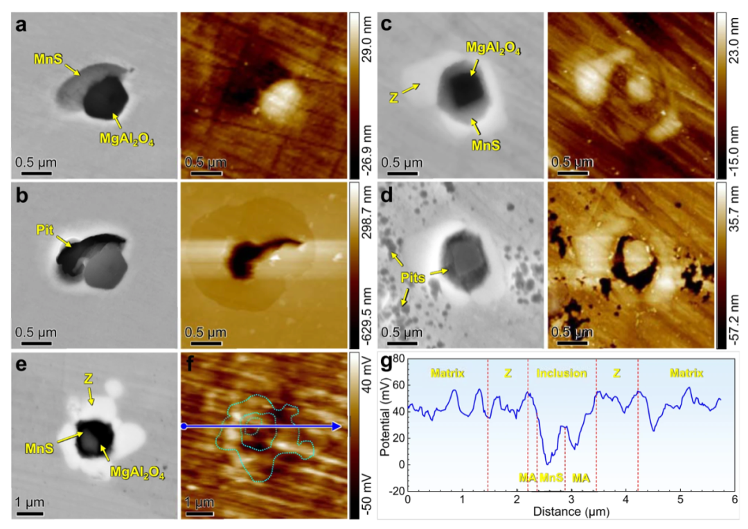 图4为S32205双相不锈钢浸泡腐蚀前后的表征。( a , c)和( b ,d)在50°C的6 % FeCl3溶液中浸泡腐蚀前的SEM形貌(左)和AFM形貌(右) b 12 h和d 10 d。0 Nb钢中a,b铝酸镁- MnS夹杂和0.25 Nb钢中c,d铝酸镁-MnS @ Z核壳结构。浸泡腐蚀前铝酸镁- MnS @ Z核壳结构的SEM形貌和f SKPFM图。( f )中箭头线标记的沿铝酸镁- MnS @ Z核壳结构的伏打电位变化。( g )中MA为铝酸镁包裹体的缩写。源数据以源数据文件的形式提供。