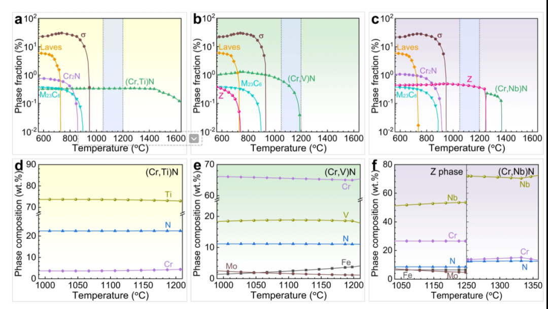 图1:微合金化S32205双相不锈钢的Thermo-Calc结果。含0.25 wt . % Ti、0.25 wt . % V和0.25 wt . % Nb的S32205双相不锈钢中相的析出行为。浅蓝色遮蔽区域代表了热加工和热处理的大致温度范围。( a )、( b )和( c )中的化学成分分别为d ( Cr、Ti)N、e ( Cr、V)N、f Z相和( Cr、Nb)N。( Cr、Ti)N、( Cr、V)N和( Cr、Nb)N属于MN型析出相,其定义分别基于( d )、( e )和( f )中的计算成分。源数据以源数据文件的形式提供。