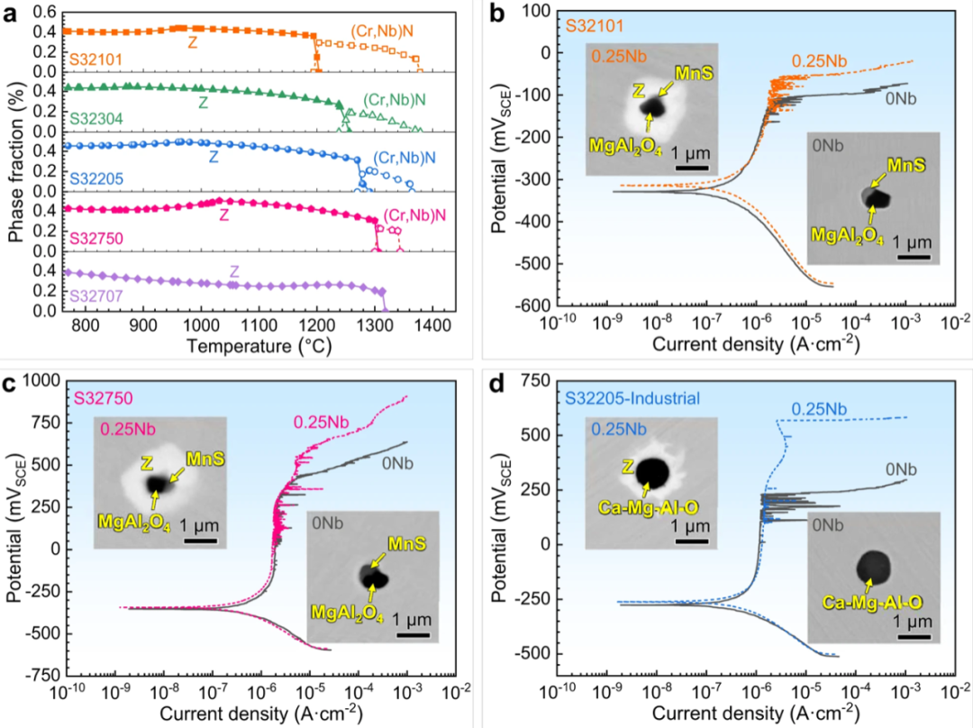 图5为Nb微合金化技术的普适性。采用Thermo-Calc计算了Nb含量为0.25 wt . %的系列DSSs中含Nb相的析出行为。b S32101、c S32750和d工业S32205双相不锈钢在72°C ( pH 8.2 )双浓度模拟海水中微合金化和不含0.25 wt . % Nb的动电位极化曲线。插入物呈现出单一包合物和包合物@ Z核壳结构的形貌。源数据以源数据文件的形式提供。