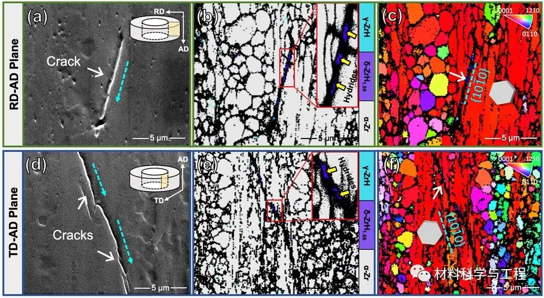 图4 沿不同观察方向表征得到的Type-II型Zr-Sn-Nb-Fe锆合金中的退火开裂组织。(a),(d) RD-AD面和AD-TD面上退火开裂组织的扫描照片。裂纹用白色箭头表示,开裂方向用浅蓝色箭头表示。(b),(e) 相图。氢化物用黄色箭头表示。(c),(f) 取向图。开裂面用浅蓝色虚线表示。