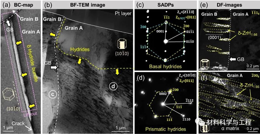 图7 柱面氢化物及基面氢化物的透射电子显微镜表征结果。(a) 提样区域示意图。其中晶粒A为开裂晶粒,相邻晶粒B为未开裂晶粒。(b) 开裂面的低倍数明场像照片。(c),(d) 图(b)中白色圆圈区域对应的选区电子衍射斑点。(e),(f) 基面及柱面氢化物的暗场像照片。氢化物用黄色虚线标出。