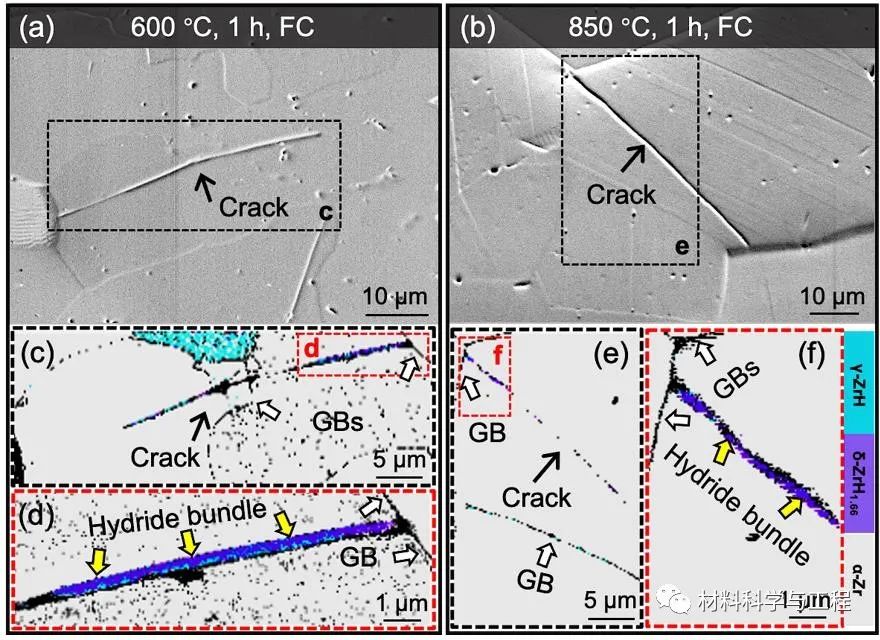 图3 纯锆中退火开裂显微组织的EBSD表征结果。(a),(b) 纯锆在不同退火参数下开裂组织的二次电子扫描照片。(c),(e) 图(a)和(b)中黑色虚线围成区域所对应的相图。α-Zr基体为灰色,δ-氢化物为紫色,γ-氢化物为浅蓝色。(d),(f) 图(c)和(e)中红色虚线围成区域所对应的局部放大图。氢化物用黄色箭头标出。