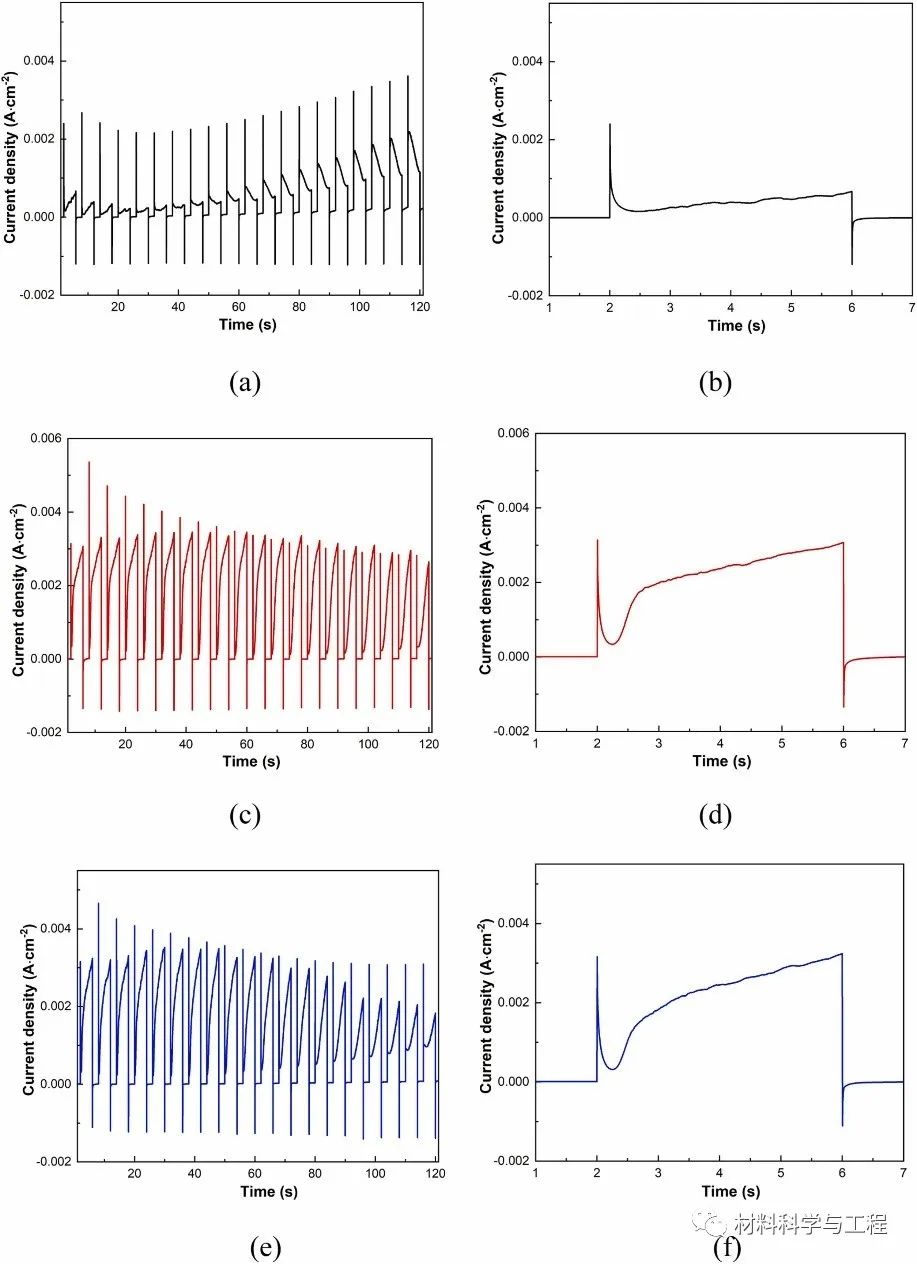 图 3.循环恒电位脉冲:(a)和(b)KCl溶液;(c)和(d) KBr 溶液;(e)和(f) KCl + KBr 溶液。