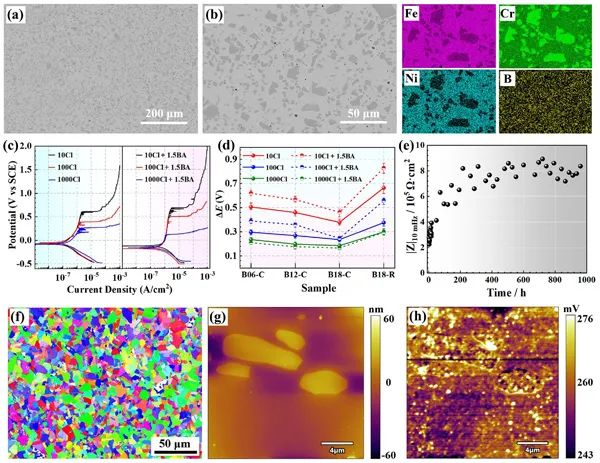 近期,中国科学院金属研究所沈阳材料科学国家研究中心材料动力学研究部王建强研究员课题组在前期乏燃料湿法贮存环境中材料腐蚀行为研究基础上,与沈阳材料科学国家研究中心材料设计与计算研究部陈星秋研究员课题组、技术支撑部崔静萍高级工程师、材料腐蚀与防护中心自然环境腐蚀研究部马爱利副研究员、中国机械总院集团沈阳铸造研究所于波研究员课题组和牛津仪器科技(上海)有限公司刘志文博士等合作,在乏燃料湿法贮存环境中含B不锈钢的腐蚀机理方面,尤其是B元素含量和H3BO3对含B不锈钢点蚀性能的影响机制方面取得了新进展。