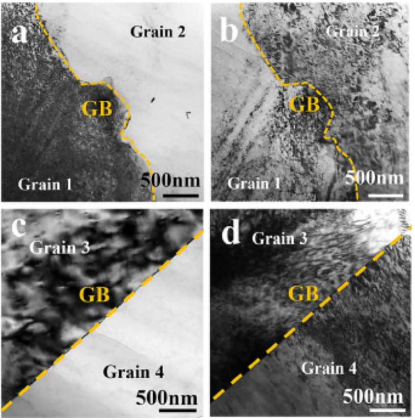 晶界(GB)是多晶材料中不同晶粒之间形成的几何必要界面,影响力学性能,如强度、延展性、蠕变和断裂。晶界可以通过滑动和迁移调节微应变来适应宏观材料的塑性变形。晶界滑动通常被认为是晶界的切向位移,而晶界迁移是晶界的法向位移。从科学理论的角度来看,作为固有塑性变形模式的晶界迁移影响着各种后续塑性机制,如晶粒起齿、再结晶和晶粒长大。对于工业应用来说,由晶界迁移引起的起齿晶界被认为可以阻碍裂纹扩展并提高蠕变抗性。