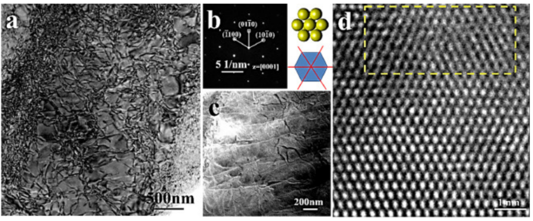 图13. AZ80合金室温多轴压缩三道次后的位错分析(a)[0001]区轴下晶粒的亮场TEM图像(b)图13a的SAED图和观测面原理图,(c)HADDF-STEM图像,(d)HRTEM图像。图13d中黄色框处存在晶格畸变。