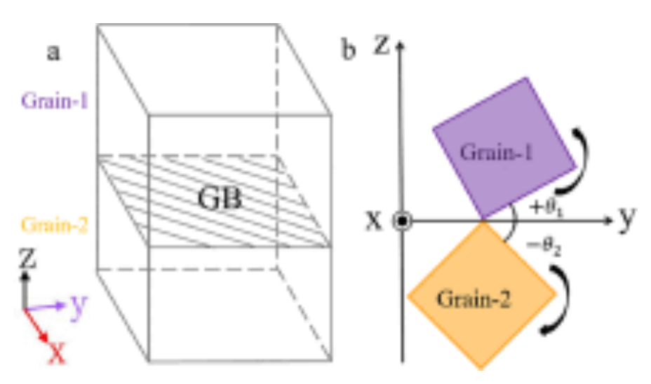 如图2b所示,其中倾斜轴为x轴,方向为[12°10])。具体参数如表1所示。得到的[12?10] ATGB双晶Mg含有约1708875个原子,尺寸(x × y × z)为240 ? ×399 ? ×410 ?, x轴、y轴和z轴的取向分别为[12?10] 、[101?0]和[0001]。