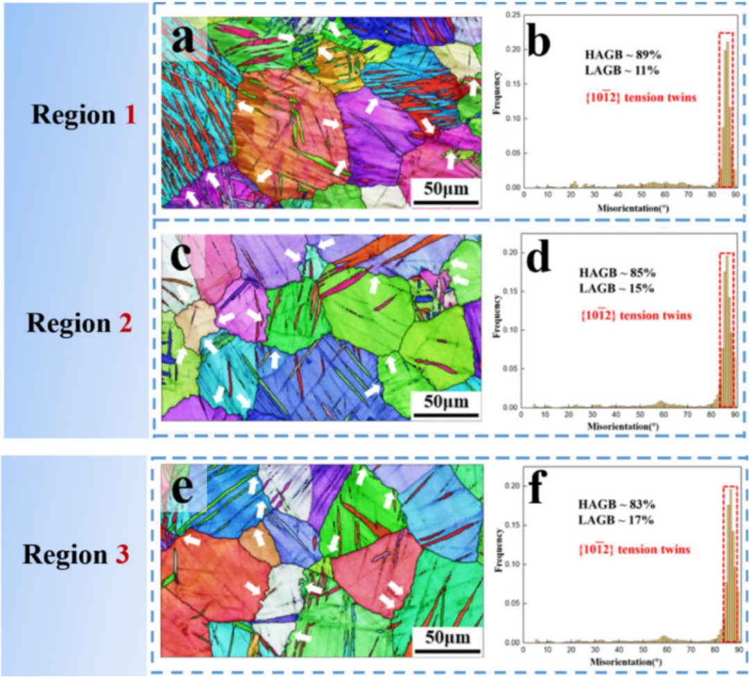 图4 变形AZ80镁合金三个区域的IPF图和相应的GB错向分布图 (a)1区IPF图和(b) 1区GB错向分布图,(c) 2区IPF图和(d) 2区GB错向分布图 (e) 3区IPF图和(f) 3区GB错向分布图。白色箭头表示锯齿状的GB