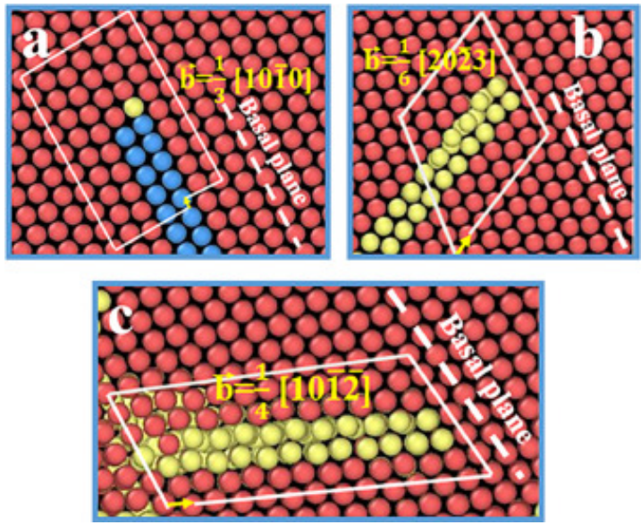 图11. 位错滑移前导部分的Burgers电路分析(用黄色箭头表示)(a) <a>基底滑移,(b)和(c)锥体I <c+a>滑移。