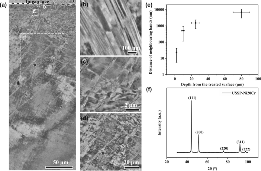 图 3. (a) USSP-Ni20Cr 试样的典型截面 SEM-ECCI 图像。白色虚线表示强化试样的表面。放大的 SEM 图像显示了从处理表面向下不同深度的微观结构:(b) 2 µm,(c) 20 µm 和 (d) 60-100 µm。(e)USSP-Ni20Cr 样品不同深度区域的带间距变化。(f) USSP-Ni20Cr 样品的 XRD 图样。
