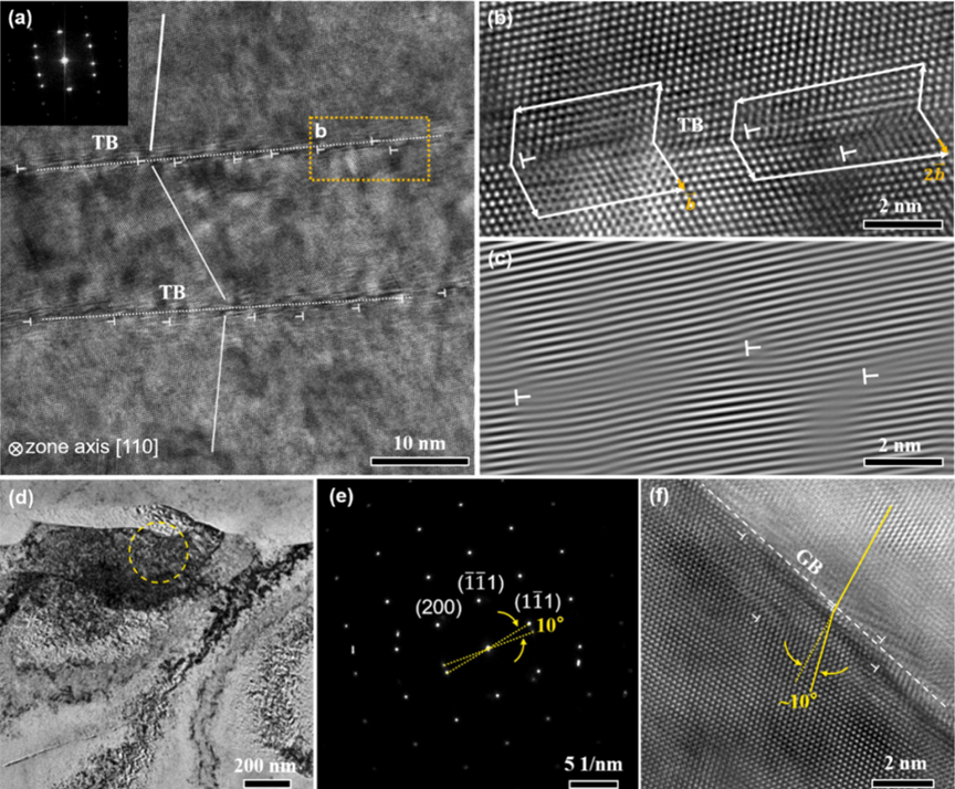 图 5. (a) 沿着 [110] 区轴线的 HRTEM 图像,显示在 USSP-Ni20Cr 合金最上面 5 µm 表层形成的纳米网。插图是其快速傅立叶变换 (FFT) 图像。白色"┬"标记的大量位错形成于纳米孪晶边界。(b) (a) 中黄色虚线矩形标记区域的放大图像,表明存在全位错。(c)与(b)相对应的一维反傅立叶变换(IFT)图像,白色"┬"表示全位错。(d) USSP-Ni20Cr 样品最顶层表面的典型横截面 TEM 亮面图像。(e)和(f)分别是显示低角度晶界证据的 SAED 图样和(d)中黄色圆圈区域的高分辨率 TEM 图像。