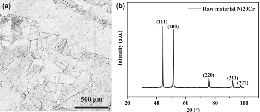图 1:(a) 1000 ℃ 退火 90 分钟后 CG-Ni20Cr 样品的金相观察结果和 (b) XRD 图。