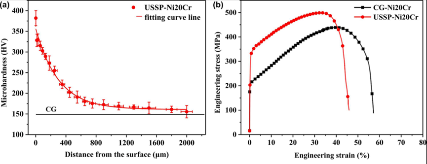 图 6. (a) USSP-Ni20Cr 的维氏硬度沿处理表面深度的变化。黑线代表 CG-Ni20Cr 样品的显微硬度。(b) CG-Ni20Cr 和 USSP-Ni20Cr 样品的准静态工程应力-应变曲线。