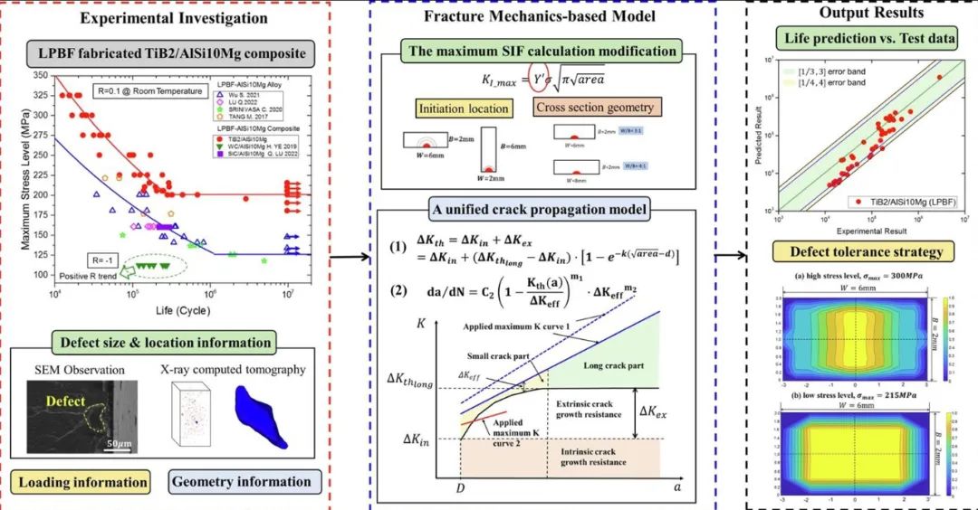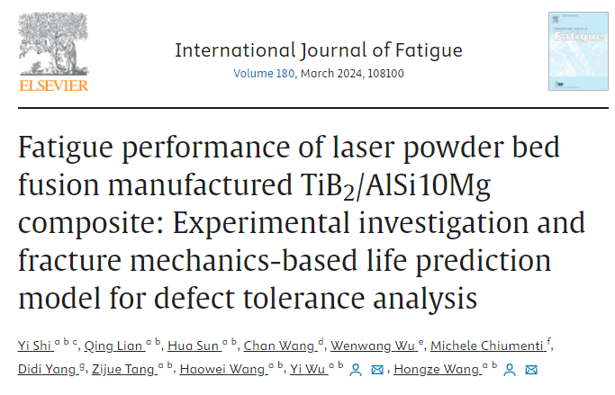 近日,上海交通大学材料科学与工程学院王浩伟教授团队在增材制造复合材料疲劳与缺陷容限评价方面在International Journal of Fatigue期刊发表题为“Fatigue performance of laser powder bed fusion manufactured TiB2 / AlSi10Mg composite: Experimental investigation and fracture mechanics-based life prediction model for defect tolerance analysis (Int. J. Fatigue 2024, 180:108100)”学术论文。