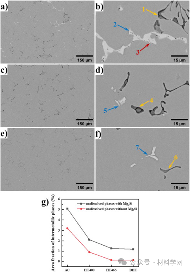 图 2 显示(a、b)HT400、(c、d)HT465 和(e、f)均质化样品微观结构的 SEM-BSE 图像,(g)不同状态下金属间相面积分数的统计结果。这里的 AC 是指均质样品。