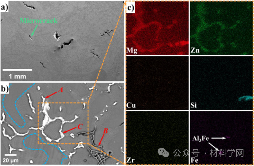 图 1 (a、b)铸件 Al-Mg-Zn-Zr 合金不同放大倍数的 SEM-BSE 图像。表 3 显示了(b)中标注的 EDS 点识别结果。(c) (b) 中橙色矩形区域的 EDS 图谱结果,显示了凝固过程中形成的组成相和微偏析。