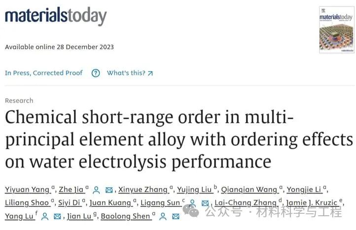 近年来,本研究团队采用可大规模制备的物理冶金技术对多类型无序合金催化材料开展了系统研究并取得了系列研究成果:Prog. Mater. Sci., 2019, 105: 100576; Adv. Mater., 2023, 35: 2303439; Adv. Mater., 2020, 32; 2000385;Adv. Funct. Mater., 2021, 31: 2101586; Adv. Funct. Mater., 2019, 29: 1807857; Adv. Funct. Mater., 2017, 27: 1702258, etc. 在此基础上,为进一步拓展结构调控策略增强多主元合金电催化活性,东南大学沈宝龙教授、贾喆教授与香港大学陆洋教授、哈工大(深圳)孙李刚教授、伊迪斯科文大学张来昌教授、新南威尔士大学Jamie J. Kruzic教授、香港城市大学吕坚院士合作提出一种全新CSRO结构构筑新方法,在Fe10Co5Ni10Cu15Al60多主元合金表面利用元素磁性诱导成功构筑CSRO结构,特殊原子有序配位结构促进水分子解离,实现碱性条件下优异双功能电解水催化性能。研究成果以题为“Chemical short-range order in multi-principal element alloy with ordering effects on water electrolysis performance”发表在Materials Today上,DOI:10.1016/j.mattod.2023.12.006。