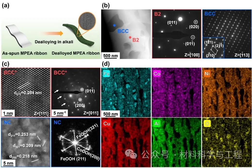图1. 多主元合金概念设计和微观结构表征。(a) 制备过程示意图;(b) 原始多主元合金条带B2、体心立方(BCC)双相结构透射电子显微镜(TEM)及选区电子衍射(SAED)图像;(c) 脱合金4小时后多主元合金条带双相结构球差校正透射电子电镜(AC-TEM)及SAED图像,原始B2相转变为普通BCC(记为BCC*)相,箭头所指漫衍射点为短程有序结构典型特征,原始BCC相转变为纳米晶相(记为NC);(d) 脱合金4小时后合金截面元素分布。