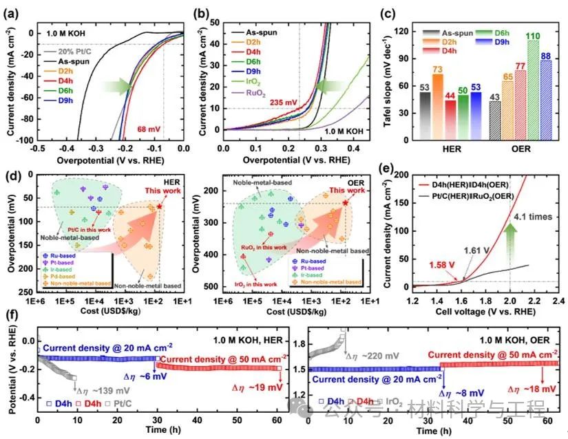 图4. 碱性电化学行为。(a) HER和(b) OER极化曲线,扫描速率为5 mV s-1;(c) Tafel斜率统计图;(d) HER和OER过电位-成本对比图;(e) 全解水极化曲线;(f) 电流密度为20和50 mA cm-2脱合金4小时多主元合金及贵金属对照组稳定性能测试,无iR补偿。