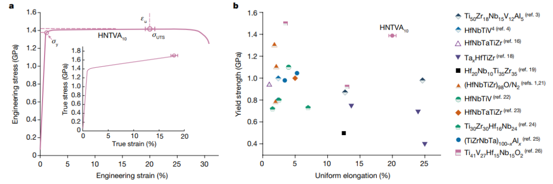 图1. HNTVA10合金的拉伸应变-应变曲线与其他高性能体心立方(bcc)多组元合金(MPEAs)的比较。
