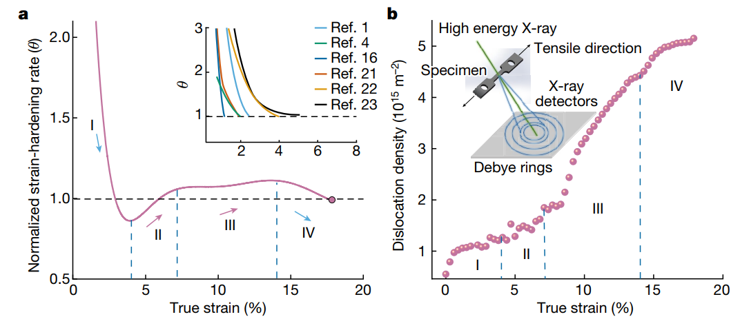 图3. 拉伸过程中的归一化应变硬化率和位错密度。