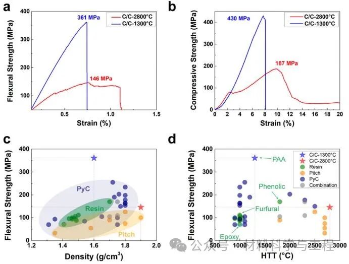 图4 C/C复合材料在1300℃和2800℃下的抗弯强度(a)和抗压强度(b)。基于密度(c)和热处理温度(d)的抗弯强度与以往研究的比较