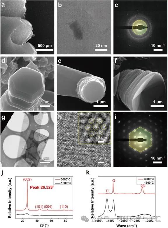图11300°C和3000°C热处理的PAA树脂的形貌和晶体特性。1300℃热处理的SEM (a),HR-TEM (b),SAED (c);3000℃热处理的SEM (d-f),TEM (g),HR-TEM (h)和SAED (i);以及碳材料的XRD曲线(j)和拉曼位移(k)