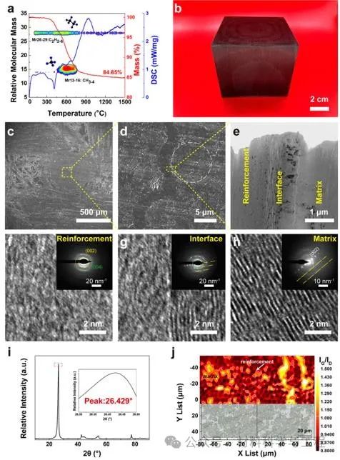 图3PAA树脂的TG-DSC-MS (a)、宏观照片(b)、SEM (c- e)、HR-TEM (f-h)、XRD (i)和高密度C/C复合材料的Raman-mapping(j)