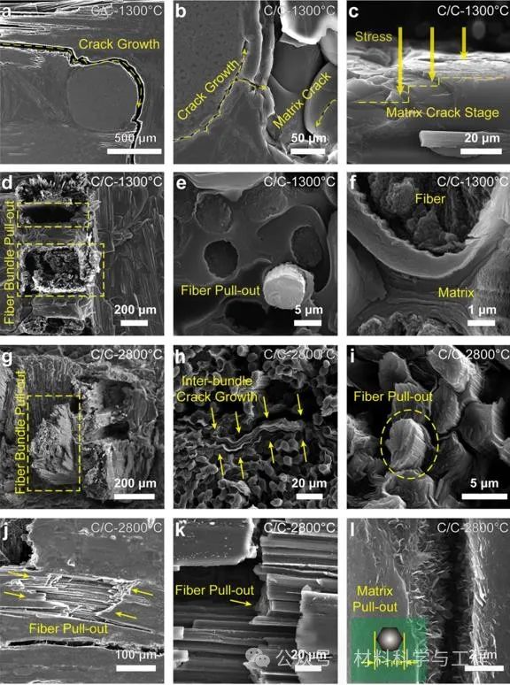 图5 C/C复合材料性能测试后的SEM图像。(a-f)在1300℃下制备的非石墨化C/C复合材料的裂纹,(g-l)在2800℃下制备的石墨化C/C复合材料的裂纹