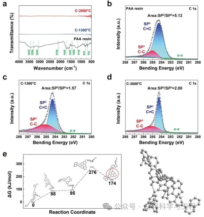 图2PAA树脂及碳化产物的FT-IR (a), XPS (b-d)和分子动力学模拟(e)。其中,C-1300°C和C-3000°C表示在1300°C和3000℃热处理条件下的碳材料