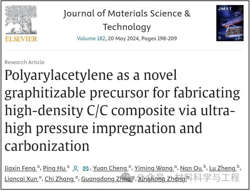 我们注意到,哈尔滨工业大学张幸红教授团队前期在《Advanced Material》期刊报道了以葡萄糖为前驱体的高性能C/C复合材料的制备技术。最近,该团队再次通过分子结构设计与工艺探索创新,在《Journal of Material Science & Technology》期刊以“Polyarylacetylene as a Novel Graphitizable Precursor for Fabricating High-Density C/C Composite via Ultra-High Pressure Impregnation and Carbonization”为题,报告了一种利用聚芳基乙炔(PAA)树脂和超高压浸渍和碳化(UHPIC)技术制备高性能C/C复合材料的新方法。文章表明,PAA树脂具有极高的炭收率(85 wt.%)、UHPIC技术具有极高的各向同性压力(超过200 MPa),共同促进了C/C复合材料的致密化。该实验实现了高密度(1.90 g/cm3)的、高石墨化程度(81%)C/C复合材料的高效制备。该复合材料表现出令人印象深刻的性能,包括146 MPa的抗弯强度,187 MPa的抗压强度和147 W/(m∙K)的室温导热系数。当C/C复合材料暴露在3000 K的氧乙炔火焰中100 s时,它表现出最小的线性烧蚀,速率为1.27×10-2 mm/s。本研究证明了PAA树脂不同于传统的树脂材料,具有特殊的石墨化特性。该文章报道的短周期和低成本的方法在航空航天应用中具有重要的前景。