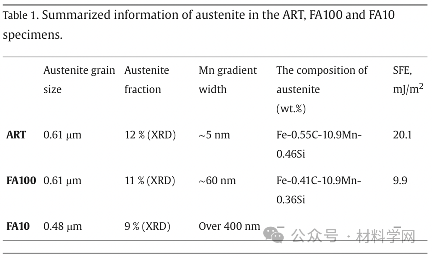 表 1. ART、FA100 和 FA10 试样中奥氏体的信息汇总。