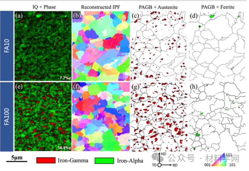 其中红色代表奥氏体相,绿色代表铁素体/马氏体相;(b, f)逆极图(IPF)先验奥氏体重建;先前奥氏体的晶界图与(c, g)奥氏体晶粒和(d, h)铁素体晶粒重叠。