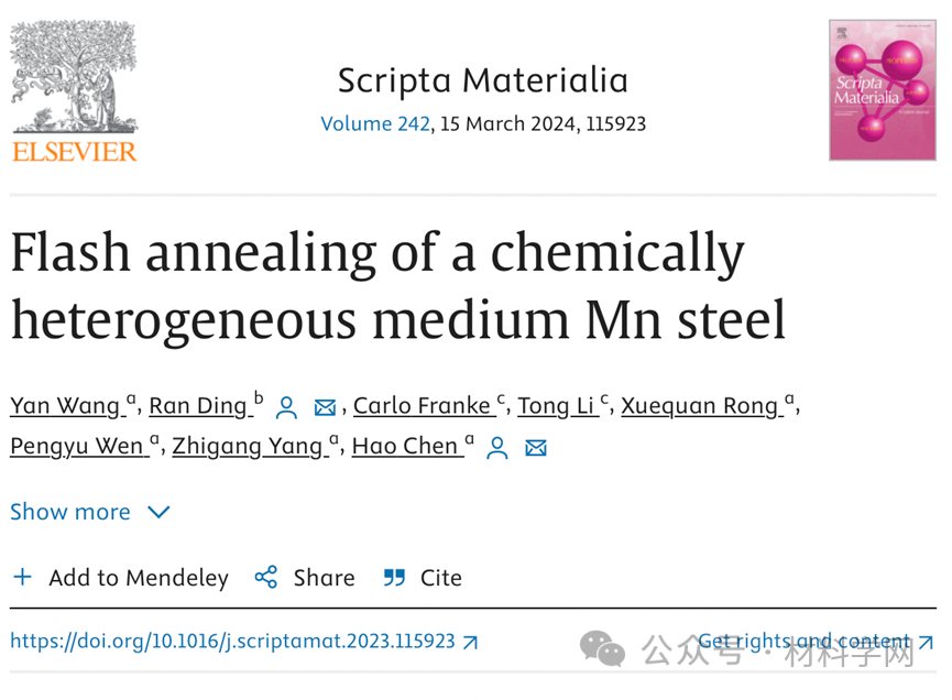 本研究旨在探索通过结合化学异质性概念和闪速加热,促进含锰 4.95 重量百分比的 MMS 的强度和延展性协同作用的可能性。在这项工作中,天津大学丁然教授团队重点研究了减少锰的体积含量以及加工参数(尤其是加热速度)对化学异质性、相变、微观结构和机械性能的影响。相关研究成果以“Flash annealing of a chemically heterogeneous medium Mn steel”发表在Scripta Materialia上。