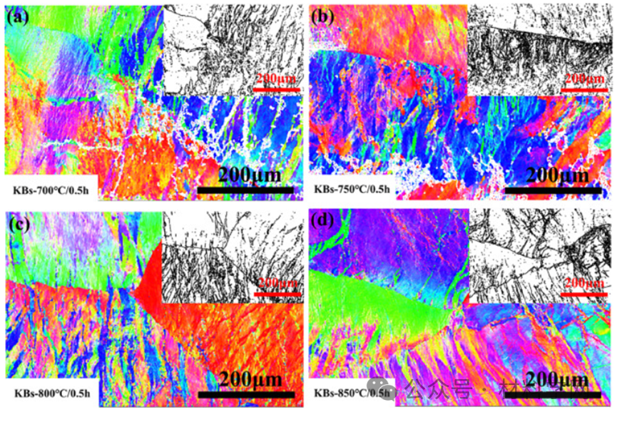 图8 Fe-Cr-Al合金不同退火显微组织的RD取向图。(a) KBs-700 °C/0.5 h、(b) KBs-750 °C/0.5 h、(c) KBs-800 °C/0.5 h 和 (d) KBs-850 °C/0.5 h。每个RD取向图右上角的缩放图显示了高角度晶界(HAGBs)的分布图。图10(a)中将描述(c)内部黑匣子的含义。