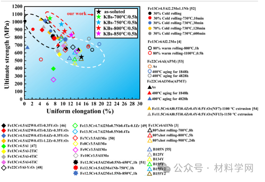 图7 Fe-Cr-Al合金的UST-UE统计图。黑色虚线框、白色虚线框和红色虚线框分别代表高强度-低延性区域、低强度-高延性区域和高强度-中等延性区域。