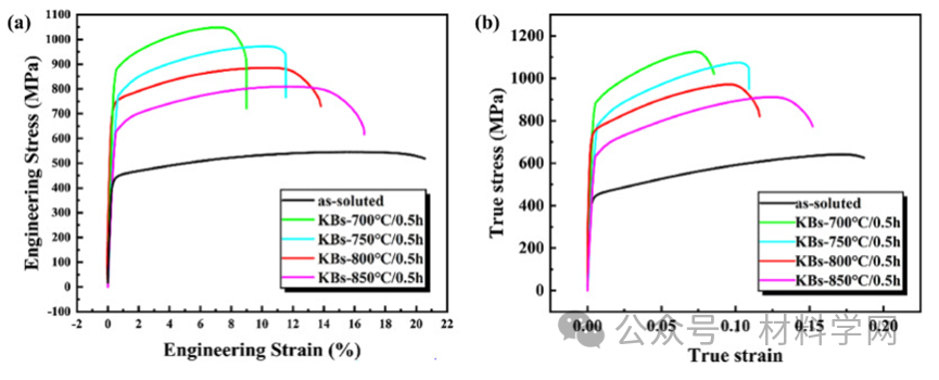 图6 Fe-Cr-Al合金的工程应力-应变曲线(a)和真实应力-应变曲线(b)。
