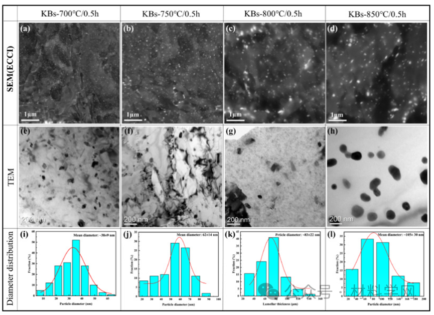 图10 KBs-700 °C/0.5 h (a, e, i)、KBs-750 °C/0.5 h (b, f, j)、KBs-800 °C/0.5 h (c, g, k) 和 KBs-850 °C/0.5 h (d, h, l) 的 SEM 和 TEM 图像以及直径分布图。