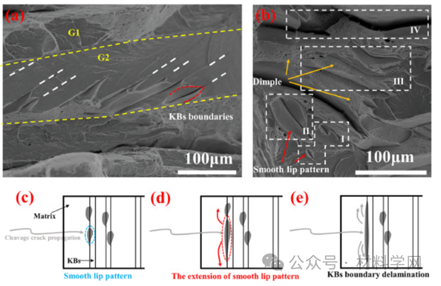 图14 唇形的SEM分析,显示KBs边界的分层。(a)在KBs边界处出现光滑的唇型,阻断了延伸;(b)I.、II.和III.区域代表唇裂的生长阶段,IV.区域表示KBs边界分层起源于唇裂的延伸。(c)、(d) 和 (e) 描绘了这种演变的示意图。