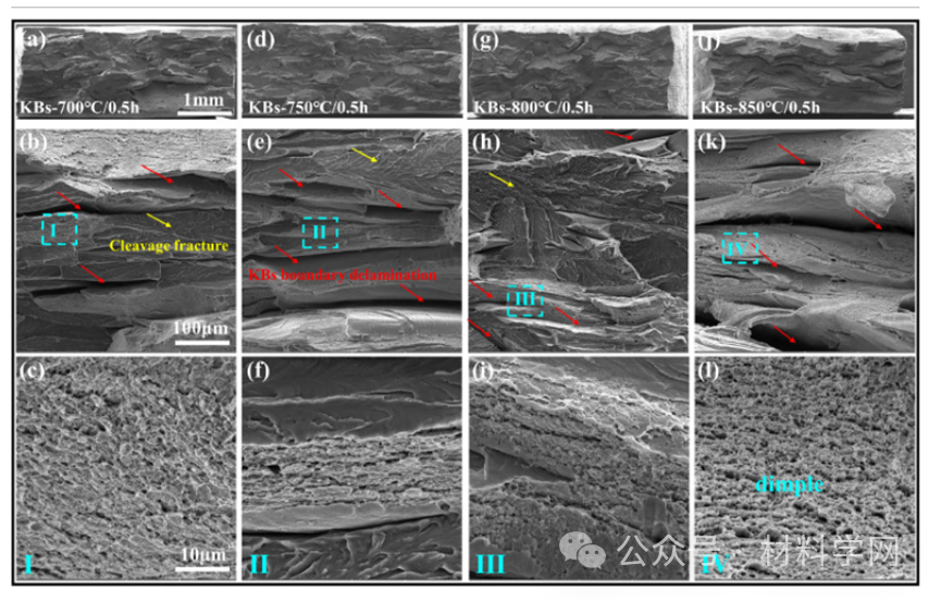图13 拉伸断裂形貌的SEM图像。(a)、(b)、(c)为KBs-700 °C/0.5 h试样的断裂面;(d)、(e)、(f)为KBs-750 °C/0.5 h样品的样品;(g)、(h)和(i)是KBs-800 °C/0.5 h样品的样品;(j)、(k)和(l)是KBs-850 °C/0.5 h样品的样品。黄色箭头表示解理断裂区域,而红色箭头表示KBs边界分层区域。