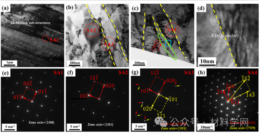 图4 热轧Fe-Cr-Al合金的TEM分析。(a)位错子结构,(b)<101>型KBs和(c)<112>型KBs的高频图像;(d) (c)中蓝色区域的HR图像;(e) SA1、(f) SA2、(g) SA3 和 (h) SA4 的 SAED 模式。