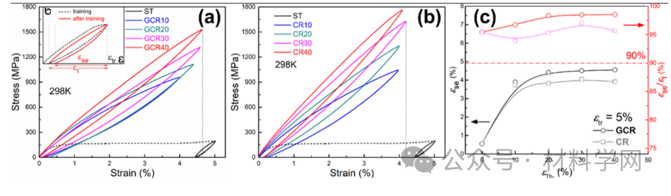 图 5. (a) GCR 样品的拉伸曲线;插图显示了训练前循环(训练应变εtr = 5 %,黑色)和训练后循环(红色)的示意曲线,其中εt 为总应变,εse 为 SE 应变。(b) CR 样品的拉伸曲线。(c) GCR 和 CR 样品的 εse 和 SE 效率(εse/εt, )随 εTh- 的变化。