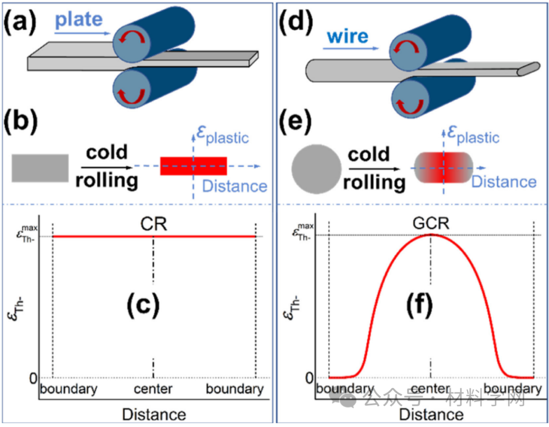 图 1. 均匀冷轧和梯度冷轧的差异示意图。分别为均匀冷轧(a-c)和梯度冷轧(d-f)过程中试样的几何形状、横截面和厚度减少的塑性变形(εTh-)。
