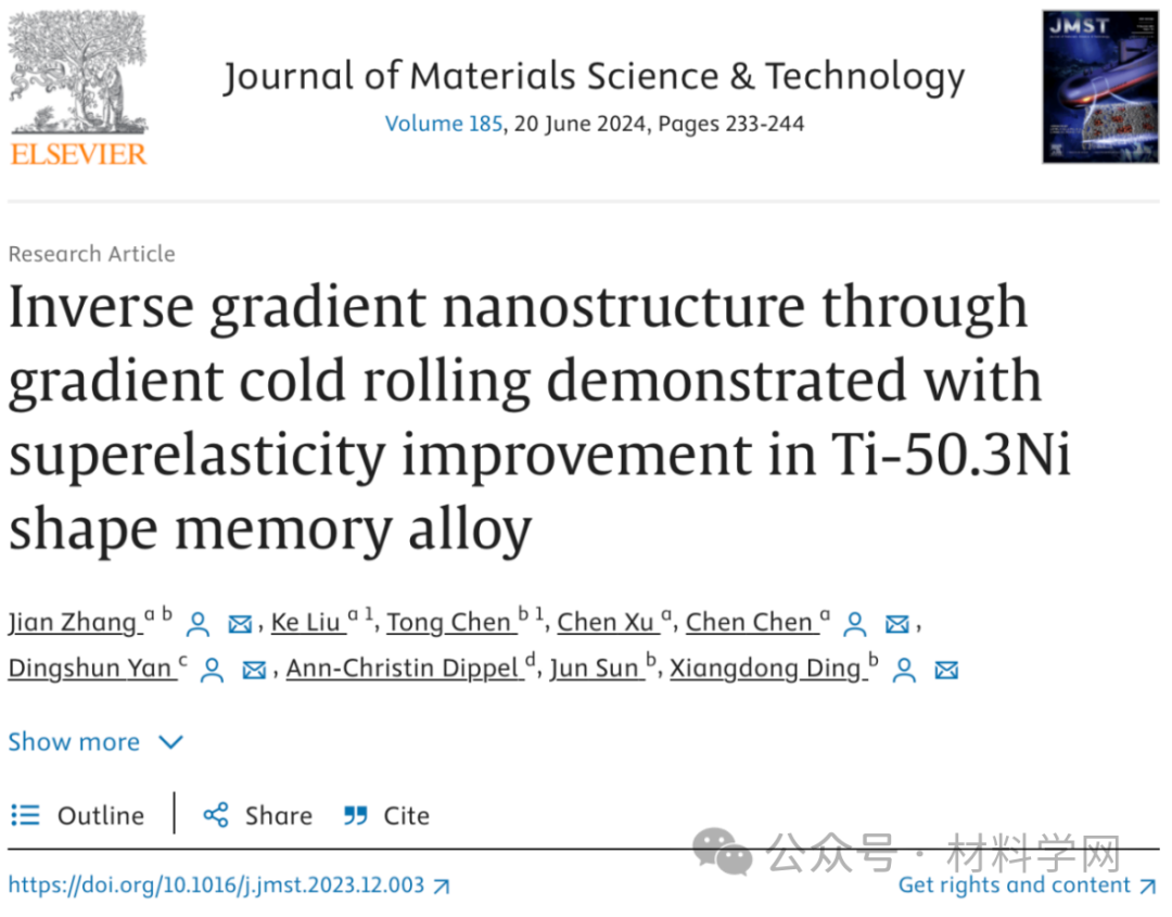 在此,江南大学张建教授团队报告了一种通过沿轴向冷轧生产 iGNS 块状金属材料的简便方法,并在钛-50.3镍形状记忆合金(SMA)线材中得到了成功验证。与厚度均匀的板材的传统冷轧(CR)不同,具有圆形截面的线材的冷轧技术被称为梯度冷轧(GCR)。与引入梯度塑性变形的 GNS 加工方法(如表面机械磨损处理和表面机械研磨处理等)不同,速度和塑性相对较低的 GCR 可能只会引发部分/可观的动态再结晶,从而在许多韧性金属材料中制造出晶粒尺寸不完整的 iGNS。幸运的是,存在大量具有亚晶粒结构单元(如 SMA 中的铁弹性马氏体、孪晶、亚晶粒等)的体系,它们可以在适度变形的情况下达到纳米尺寸。这就是选择 Ti-Ni SMA 首次展示 iGNS 块状金属材料的主要原因。相关研究成果以题“Inverse gradient nanostructure through gradient cold rolling demonstrated with superelasticity improvement in Ti-50.3Ni shape memory alloy”发表在Journal of Materials Science & Technology上。