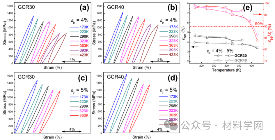 图 6. GCR 样品在不同温度下经过一个预培训周期后的拉伸结果。(a、b)为 GCR30 和 GCR40 样品在不同温度下的拉伸曲线(εtr = 4 %)。(c、d)为 GCR30 和 GCR40 样品在不同温度下的拉伸曲线(εtr = 5 %)。(e) GCR30 和 GCR40 样品的εse 和 SE 效率(εse/εt)随温度的变化。