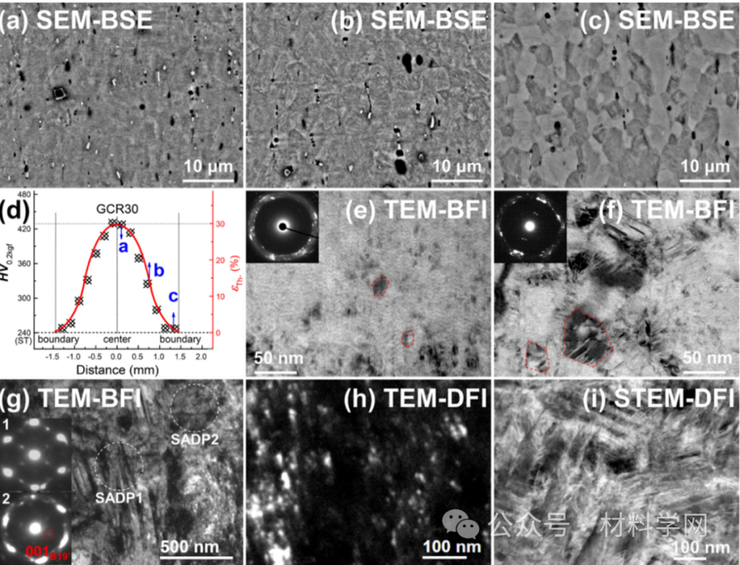 图 2. 在 298 K 下对 Ti-50.3Ni GCR30 样品进行的显微结构表征和硬度测试。(a-c)为从(d)中标注的位置拍摄的 SEM-BSE 图像。(d)HV(数据点,左 Y 轴)和相关 εTh-(红色拟合曲线,右 Y 轴)沿截面径向的变化。(e-i)是中心区域两种代表性微观结构的 TEM 显微照片:1)纳米晶粒区域(e,f),用红色虚线勾勒出两个代表性纳米晶粒;2)"粗 "晶粒区域,包括宏 B19'(g,i)和纳米 B19'(h),其中(i)显示位错单元或子晶粒。相应的 SADP 显示在(e-g)的插图中;在(g)中,红圈标出了(h)中 DFI 的 001B19' 点。