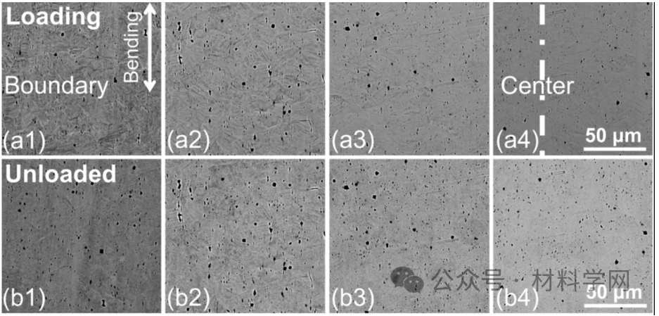 图 9. 原位 SEM-BSE 图像。三点弯曲下 GCR30 样品的最大应变位置:(a)加载和(b)卸载状态。(a1-a4)图 S7(a)中红色虚线方框标记的不同位置的四张放大 SEM-BSE 图像:(a1)边界,(a2、a3)中间区域和(a4)中心区域;同样,图 S7(b)中蓝色虚线方框标记的(b1-b4)也是在卸载后。