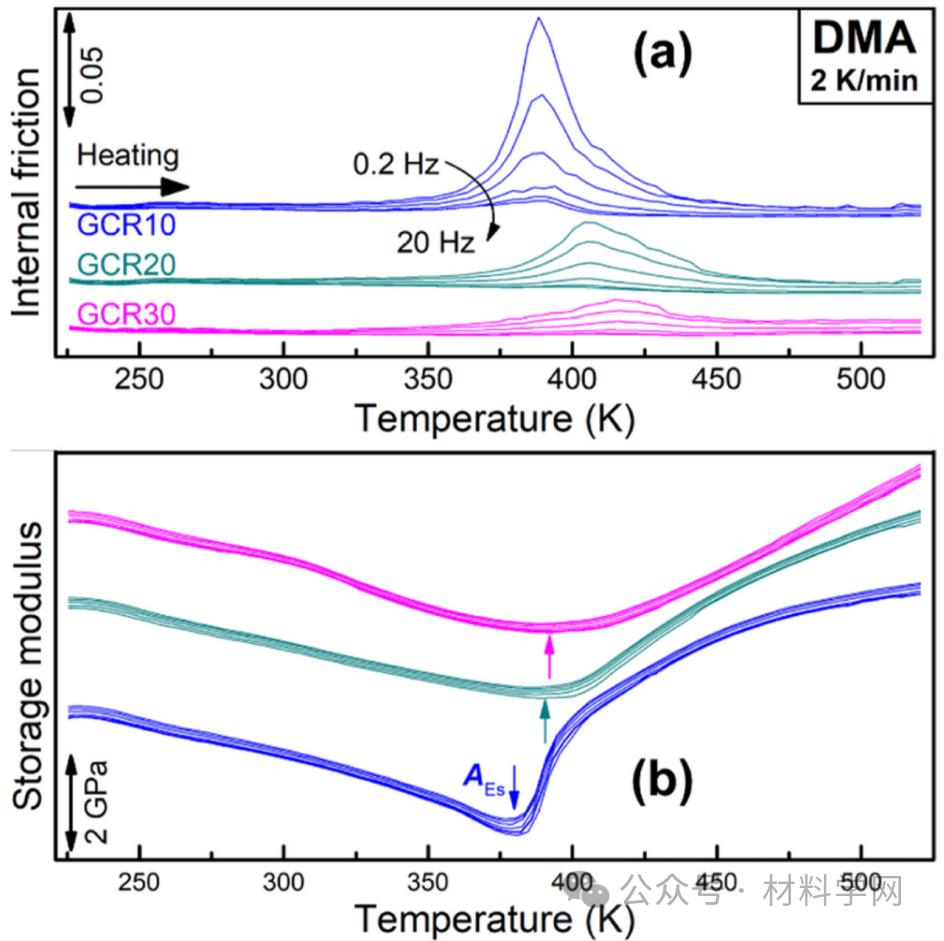 图 4. DMA 结果。(a) GCR10、GCR20 和 GCR30 样品在加热过程中的存储模量和 (b) 内摩擦力曲线。